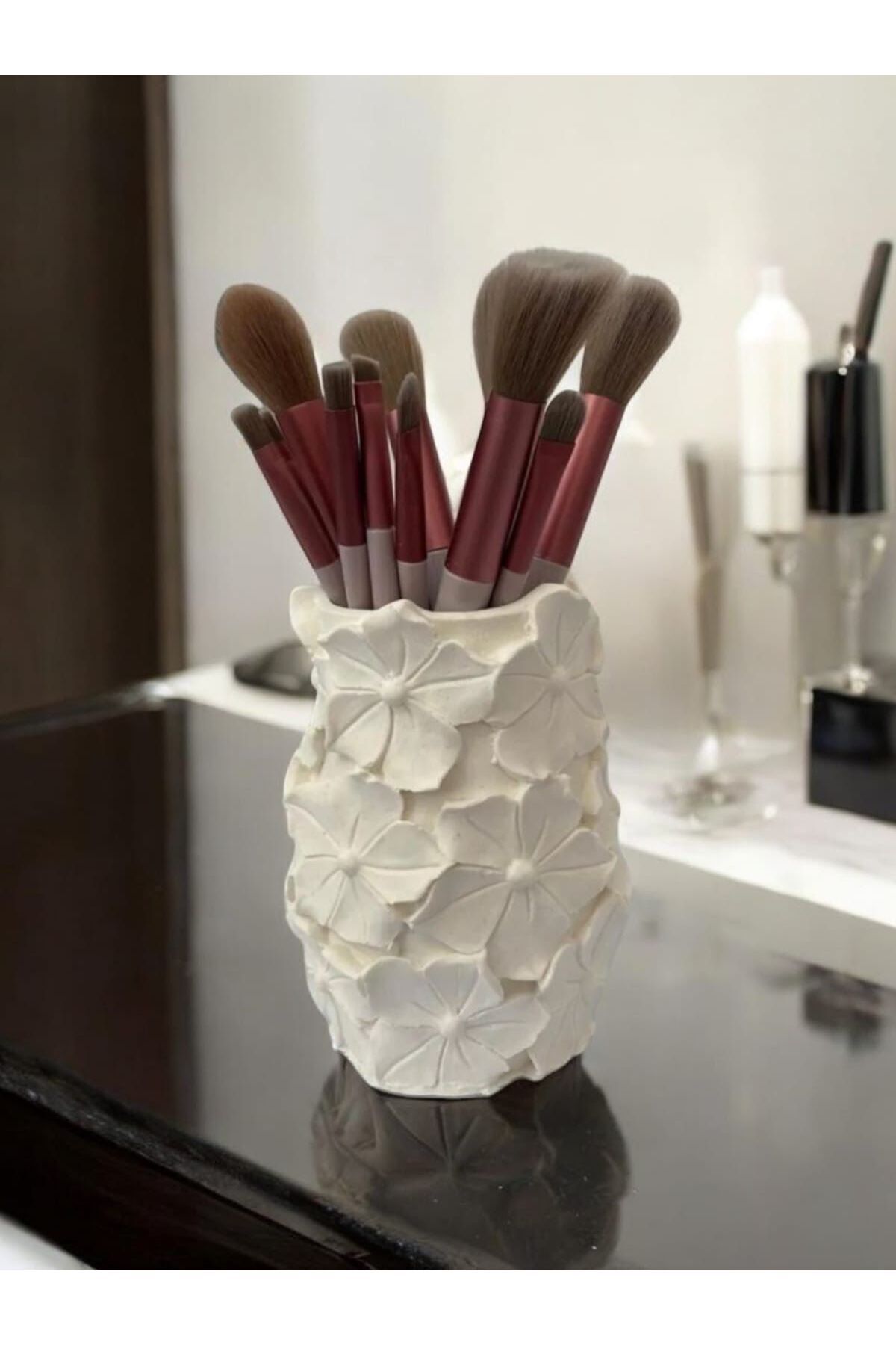 Bu zarif çiçek desenli vazo, dekorasyon ve işlevselliği bir araya getiriyor.; El işçiliğiyle özenle hazırlanmış olan bu dekoratif vazo, iç mekanlarınıza şıklık katarken aynı zamanda kalemlik olarak da kullanılabilir.; Çalışma masanızda, ofisinizde ya da evinizde düzen sağlayan bu çok amaçlı organizer, yaşam alanlarınızı güzelleştirirken, hem kalemlerinizi hem de diğer kırtasiye malzemelerinizi toplu tutmanıza yardımcı olur.; Çiçek desenleri, bu vazoyu benzersiz kılarken, içindeki taze çiçekler veya kuru bitkilerle dekorasyonunuzu tamamlayabilirsiniz.; Bu çok yönlü ürün, hem dekoratif bir aksesuar hem de fonksiyonel bir kalemlik olarak tercih edilebilir.; Vazo, masa üstü düzenlemelerinde kullanılarak odanıza sofistike bir hava katacaktır.; Evinizin her köşesinde estetik bir dokunuş arayanlar için ideal olan bu çiçek desenli vazo kalemlik, organizasyon çözümleri sunarken aynı zamanda dekorasyonunuzu zenginleştirir.; Şık tasarımı ve pratik kullanımıyla, bu vazo kalemlik, hem ev dekorasyonunuza katkı sağlayacak hem de kalemlerinizi düzenli tutmanıza olanak tanıyacaktır